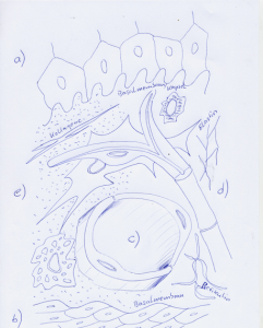 Abb. 1 Zeichnung des Systems der Grundregulation nach Pischinger mit a) Epithel oder Synovialis, b) Parenchym, c) Kapillare im Endothel, d) bemarkte und unbemarkte Nervenfasern einschl. Nozizeptoren, e) Grundsubstanz mit nicht sessilen Zellen wie Fibroblasten, Mastzellen etc.