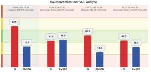 Dagegen scheint die Analyse der Vegetativums mittels der Messung der Herz-Raten-Variabilität (HRV) (Abb.4) besser handhabbar, nachvollziehbar und dokumentiertbar zu sein. Sie ergänzt nicht nur leitlinietreu, sondern „verbindet“ unterschiedliche Regulationstests wie Pupillomotorik, Dunkelfeld, Thermoregulation, Biophotonen und Aurafotographie mit therapeutischen Naturheilverfahren, was immer größere Bedeutung bei der Diagnostik des Müdigkeits-, Erschöpfungs- bzw. Chronic Fatigue Syndroms (CFS) dar [25].
