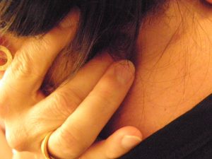 Abb.2 Palpation der Nackenreflex- bzw. Druckpunkte nach Adler und Langer mit der rechten Hand (Zeigerfinger orientirend am Occiput und Mittelfinger palpiert in leichter Beugestellung am Patienten links)
