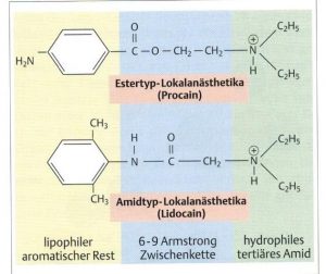 Lokalanästhetika (LA) sind amphile Ester oder Amide mit einem lipophilen aromatischen Rest und einer hydrophilen polaren Stickstoffverbindung. Sie unterscheiden sich in der Zwischenkette bzw. anhand der Liganden. In einer wässrigen Lösung verändert sich je nach ph-Wert der pk-Wert (Verhältnis zwischen der ungeladenen basischen sowie der geladenen kationischen Form), so dass bei einem neutralen ph-Wert 30-40% des LA als basischer Anteil vorliegt, welcher diffundieren kann (cave: saure Entzündung). Ester bzw. LA mit einem hohen pk-Wert haben somit schlechtere Verteilungskoeffizienten. Amide penetrieren besser ins Gewebe. LA durchdringen nicht die intakte Haut (Ausnahme: z.B. Tetracain) und müssen intrakutan, subkutan und tiefer injiziert werden. Einige (z.B. Procain und Lidocain) wirken auch systemisch nach intravenöser Gabe. Die Wirkung vor Ort ist konzentrations- und dosisabhängig. Ester werden vorwiegend vor Ort durch ubiquitär vorkommende Esterasen und Amide erst in der Leber abgebaut. Ihre Halbwertzeiten schwanken von 15 min (Procain) bis mehrere Stunden (z.B. Bupivacain, Ropivacain). Es entstehen teilweise toxische Substanzen (z.B. bei Lidocain), welche ausgeschieden werden müssen. So sind Amide generell toxischer als Ester. Haltbar sind LA nur als Hydrochlorid. Stabilisatoren erhöhen gerade in Durchstechflaschen jedoch zusätzlich die Toxizität und Allergenität aufgrund der Konservierungsstoffe und Verschlüsse. [1,2]