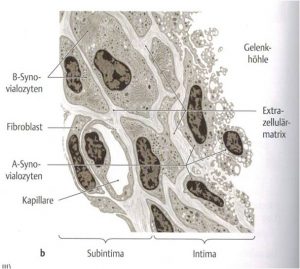 In so genannten Keimzentren („germinal centre“ bzw. gc) erfolgt die Prägung der Plasmazellen nach erstem Antigenkontakt. Diese wandern wie die B-Gedächtniszellen und Makrophagen in die Synovialmembran ein. Sobald reife Zellen zu einem anderen Zeitpunkt bereits Kontakt mit Antigenen hatten, verstärkt sich die TH2-Antwort. Der Ausprägungsgrad ist abhängig von einer angeborene IL-10 Expression (knorpelprotektiver Effekt) und erklärt den inflammatorischen Charakter der degenerativen Gelenkerkrankung. [4,5,6]