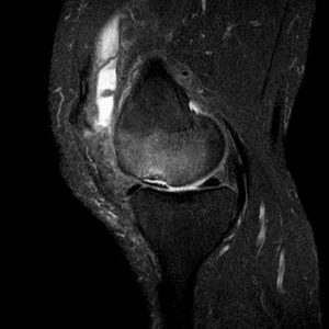 Die fettsupprimierte Magnetresonanztomographie (MRT) hat eine hohe Sensitivität und auch Spezifität, wobei nie genau der Inhalt eines Ergusses diagnostiziert werden kann (Abb.11 und 12).