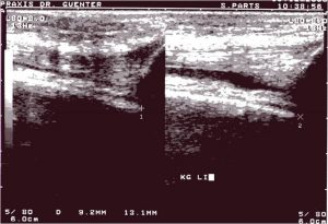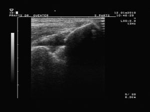 Die Sonographie zeigt einen echoarmem Raum innerhalb eines Gelenkes (Abb.9 und 10) bzw. um eine Sehne (Spiegelei-Phänomen).